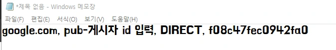 그럼 google.com, pub-게시자 ID, DIRECT, f08c47fec0942fa0 라는 문구와 함께 복사.버튼이 보일텐데요.