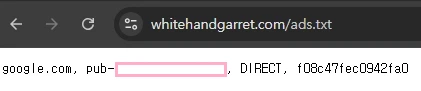 그리고 Ads.txt 설정이 잘 추가가 됐는지 확인해야하는데요. 주소창에 https://블로그주소 또는 2차도메인 주소/ads.txt를 입력 하면 설정한 Ads.txt 내용이 표시되며 위와 같은 화면이 나올 거에요.