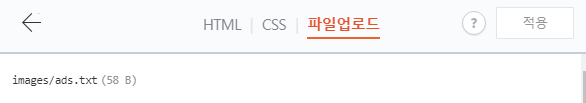 html을 클릭한 후 파일 업로드에서 방금 만든 Ads.txt 파일을 추가해 줍니다. 적용 버튼이 보이지만 올린 후에 자동으로 저장되는 거니 스킨 편집 탭을 편하게 닫아 주세요.