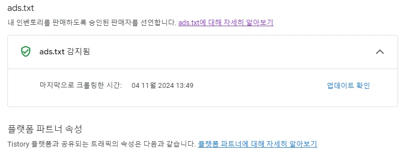 그럼 1~3일 기다리지 않고 업데이트 확인만 눌러주면 Ads.txt 감지됨으로 변경 되면서 해결 될거에요.